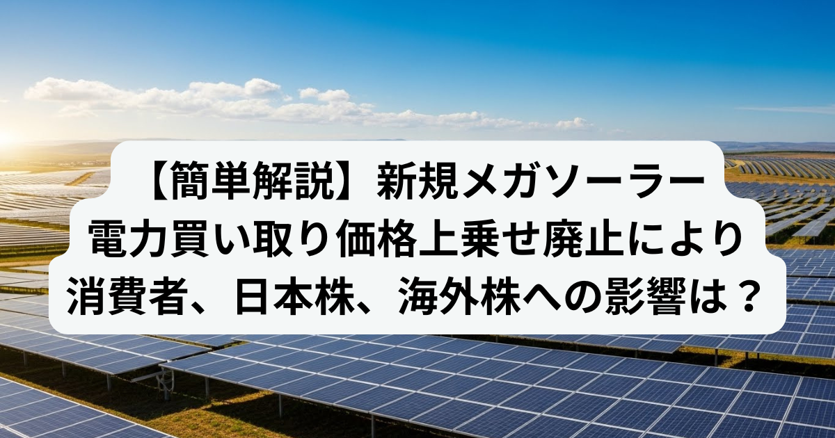 2025年12月14日(日)、Yahoo!ニュースで「新規メガソーラー、電力買い取り価格上乗せ廃止へ…消費者が支払う再エネ賦課金が原資」という記事が報じられました。本記事では、電力買い取り価格上乗せ制度とは何か、再エネ賦課金の仕組み、廃止による消費者や株価への影響について整理しました。