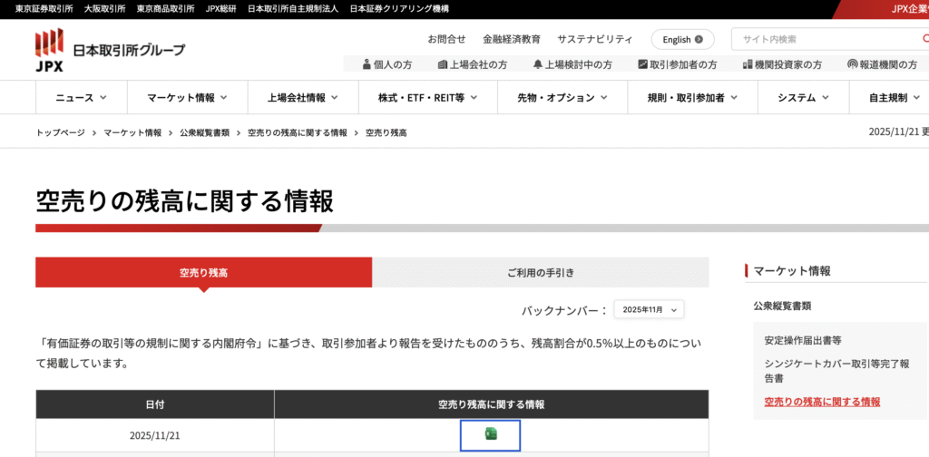 具体的には、発行済株式数の 0.5%以上 の大口空売りについて、JPXが「空売り残高情報」として日次で公表しています。データはExcel形式で取得でき、過去13か月分を参照可能です。