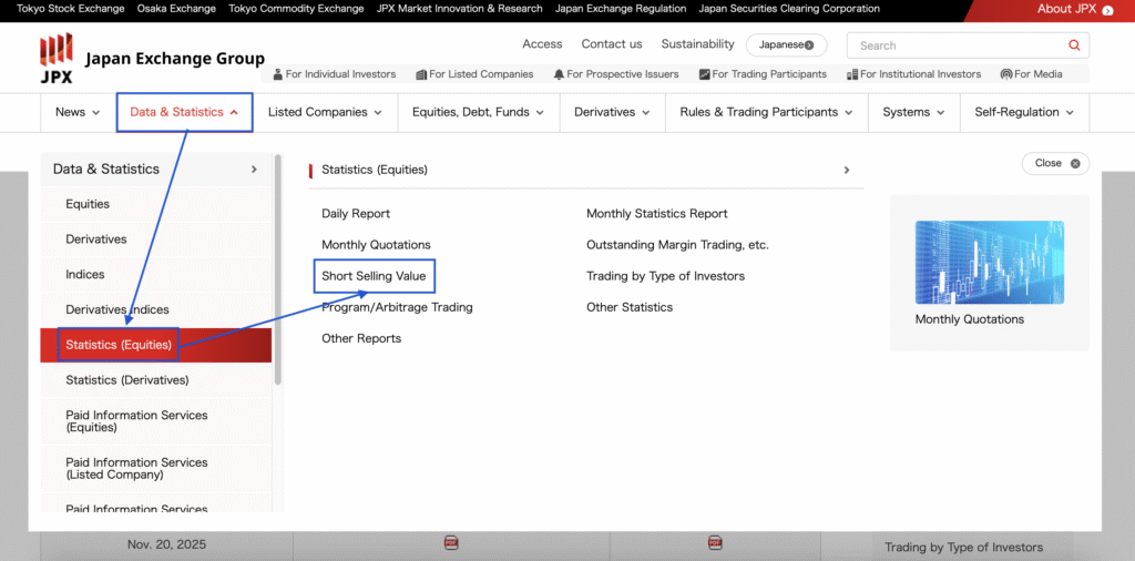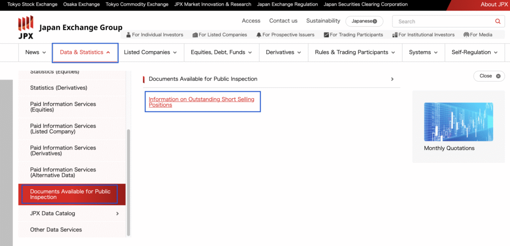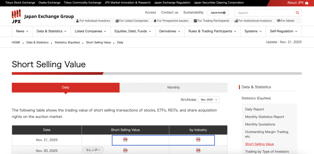 - Short selling information in Japan is freely available on the JPX website as daily, monthly, and sector-level data.