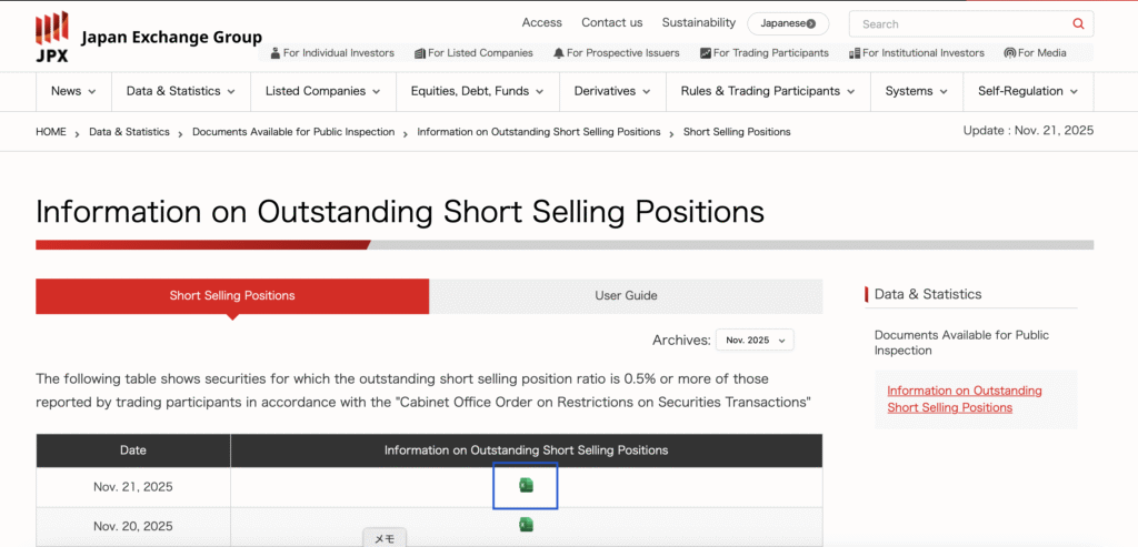 Specifically, large short positions equal to 0.5% or more of a company’s outstanding shares are disclosed daily by JPX as “Outstanding Short Selling Positions.” Data can be downloaded in Excel format, with historical data for the past 13 months.